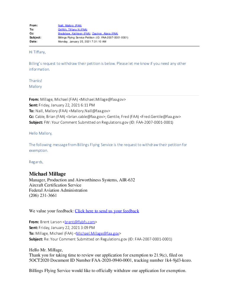 From: To: Cc: Subject: Date:Nail, Mallory (FAA) Griffith, Tiffany N (FAA) Bradshaw, Kathleen (FAA); Partner, Alana (FAA) Billings Flying Service Petition (ID: FAA200700010001) Monday, January 25,