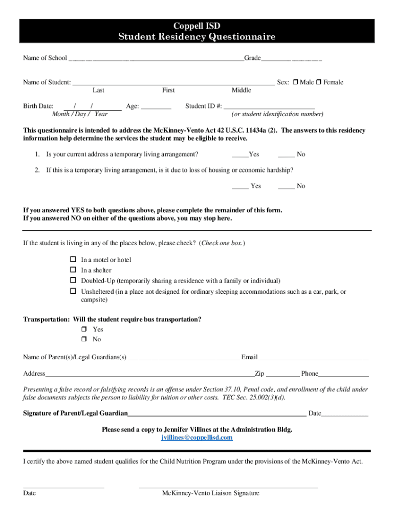 Copper ISD Student Residency Questionnaire Name of School ___Grade___ Name of Student: ___ Sex: Male Female Last First Middle Birth Date: / / Month / Day / Yardage: ___Student ID #: ___ (or student