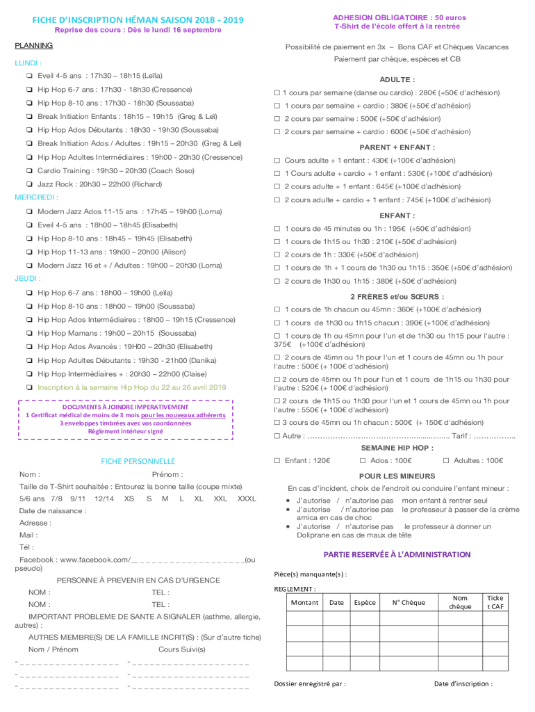 FICHE INSCRIPTION HUMAN SAIGON 2018 2019ADHESION OBLIGATORY : 50 euros Shirt de Cole offer la enterprise DES course : DS LE Lundy 16 September PLANNINGPossibilit de pavement en 3x Boys CAF et Ch ques