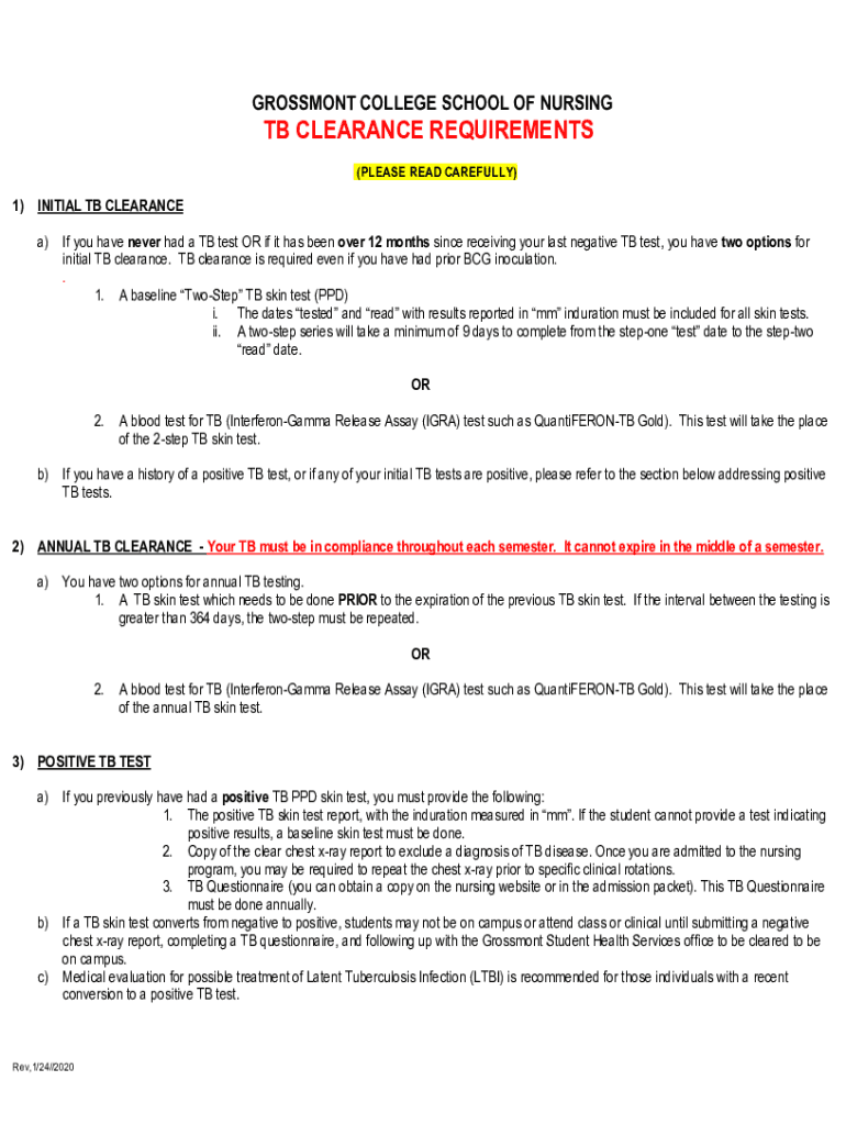 GROSSMAN COLLEGE SCHOOL OF NURSING TB CLEARANCE REQUIREMENTS (PLEASE READ CAREFULLY×1) INITIAL TB CLEARANCE a) If you have never had a TB test OR if it has been over 12 months since receiving your