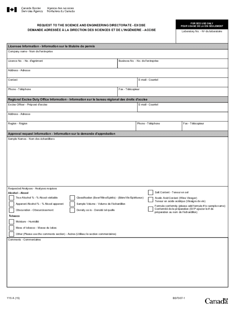 Prestore RestaurerREQUEST TO THE SCIENCE AND ENGINEERING DIRECTORATE EXCISE DEMAND ADDRESS LA DIRECTION DES SCIENCES ET DE L\'LINGERIE ACCISEAideFOR USED USE ONLY POUR USAGE DE LA DSI SEULEMENTLaboratory