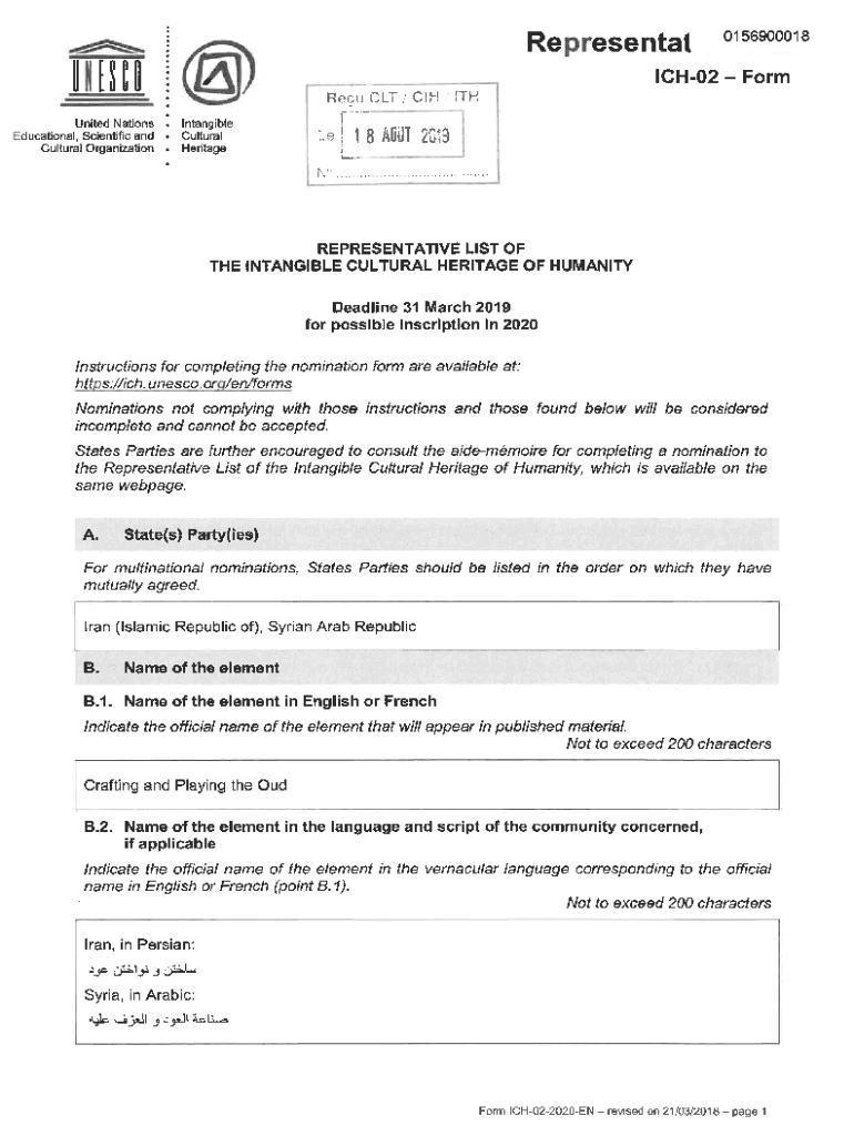 Re \'esentat156900018ICH02 Form Result×CSH United Nations. Intangible educational, Scientific and. CulturalCultural Organization. HritageITHLe ! 1 8 NOT 2019REPRESENTATIVELIST0F THE INTANGIBLECULTURALHERITAGE0F