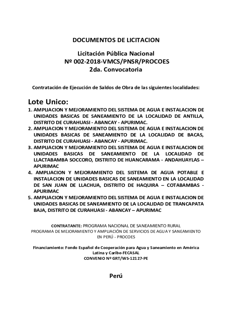 DOCUMENTS DE LIMITATION Public National N 0022018VMCS×PNS×PROCESS 2da. Convocatoria Contratacin de Ejecucin de Saldos de Obra de leis migraines localities:Love UNIDO:1. AMPLICON Y MEJORAMIENTO DEL