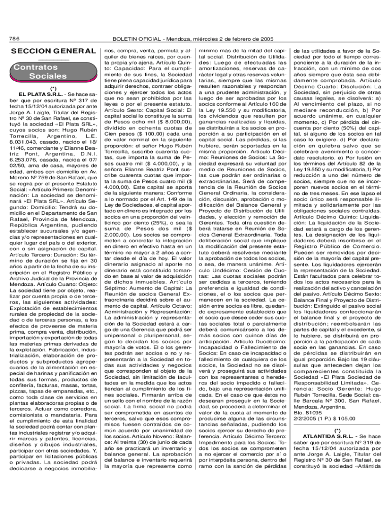 786BOLETIN OFFICIAL Mendoza, circles 2 de Ferraro de 2005SECCION GENERAL ___Contraltos Socials (*) EL PLATE S.R.L. Se have saber Que POR scripture N 317 DE tech 15×12/04 authorized POR ante Jorge