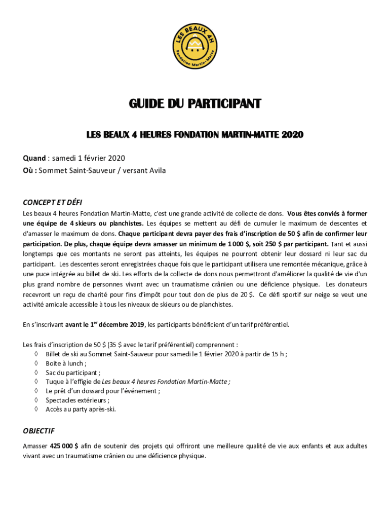 GUIDE DU PARTICIPANT LES BEAU 4 HERE FOUNDATION MARTINGALE 2020 Quad : named 1 frier 2020 O : Somme SaintSauveur / verdant AvilaCONCEPT ET DFI Les Beau 4 here Foundation Martingale, c\'BS tune Grande