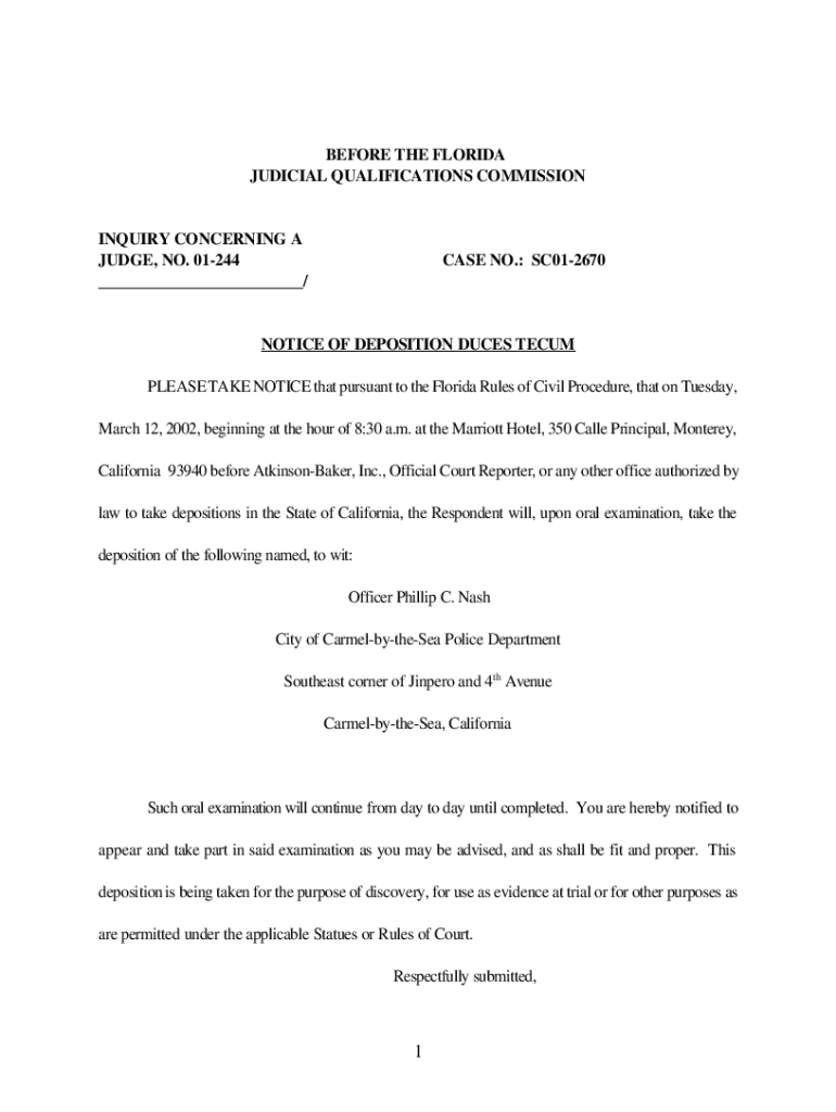 BEFORE THE FLORIDA JUDICIAL QUALIFICATIONS COMMISSIONINQUIRY CONCERNING A JUDGE, NO. 01244 ___/CASE NO.: SC012670NOTICE OF DEPOSITION DUCES TECUM PLEASE TAKE NOTICE that pursuant to the Florida Rules