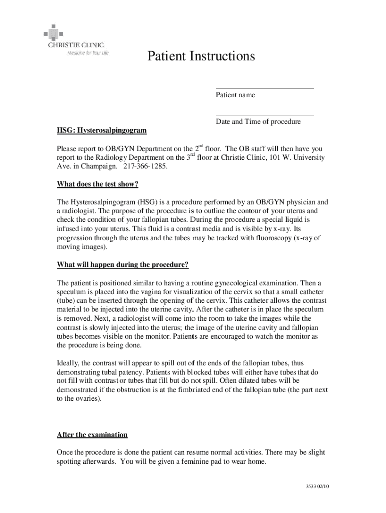Patient Instructions ___ Patient name ___ Date and Time of procedure SG: Hysterosalpingogram Please report to OB×GUN Department on the 2nd floor. The OB staff will then have you report to the Radiology