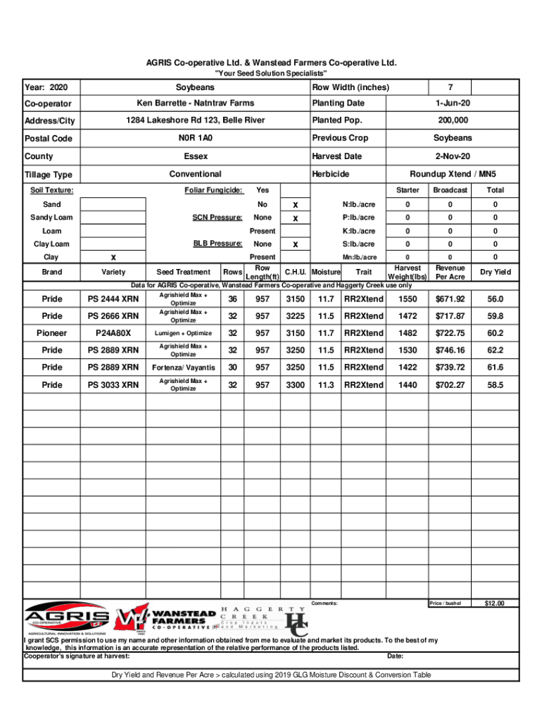 GRIS Cooperative Ltd. & Wan stead Farmers Cooperative Ltd. \” Your Seed Solution Specialists\” Year: 2020SoybeansRow Width (inches×Cooperator Ken Barrette Natural Transplanting Date1Jun20Address×City1284