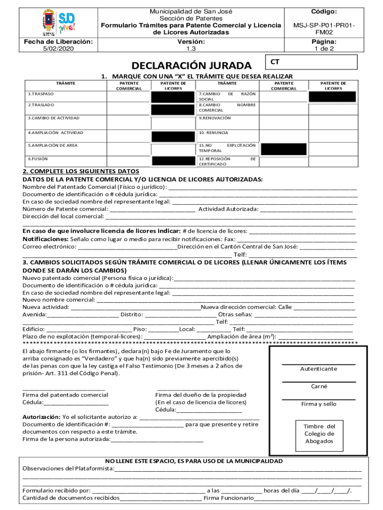 Cargo:Municipalized de San Jo's Section de Patentes Formulation Termites para Patent Commercial y License de Licores AutorizadasMSJSPP01PR01FM02Versin: 1.3Pgina: 1 de 2Fecha de Liberation: 5×02/2020DECLARACIN