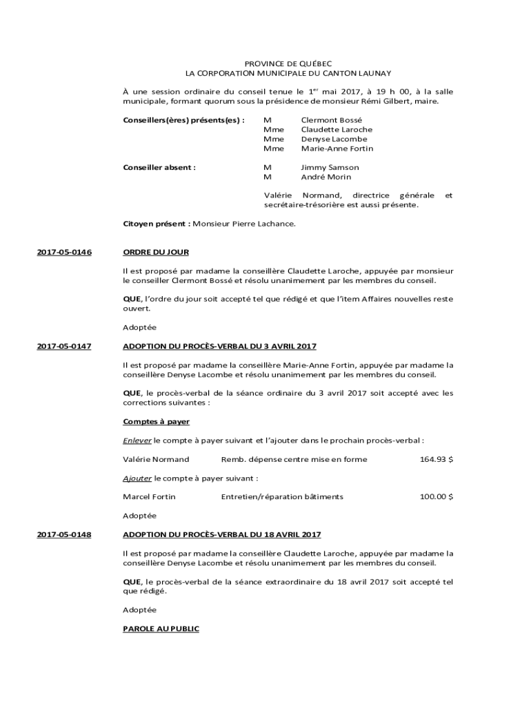 PROVINCE DE QUEBEC LA CORPORATION MUNICIPAL EDU CANTON LAUNCH one session ordinary Du Conrail tenure LE 1er Mai 2017, 19 h 00, la sale municipal, format quorum sous la residence DE monsieur RMI Gilbert,