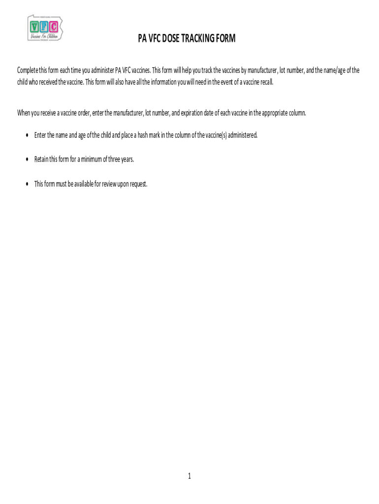 PA AFC DOSE TRACKING FORM Complete this form each time you administer PA AFC vaccines. This form will help you track the vaccines by manufacturer, lot number, and the name×age of the child who received