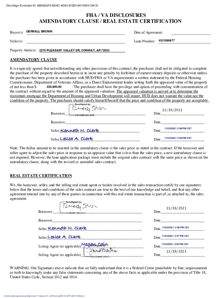 FHA / VA DISCLOSURES AMENDATORY CLAUSE / REAL ESTATE CERTIFICATION Buyer’s)MERRILL Brownsville’s) Property Address:Date of Agreement: Loan Number:43210908772270 PLEASANT VALLEY DR, CONWAY, AR
