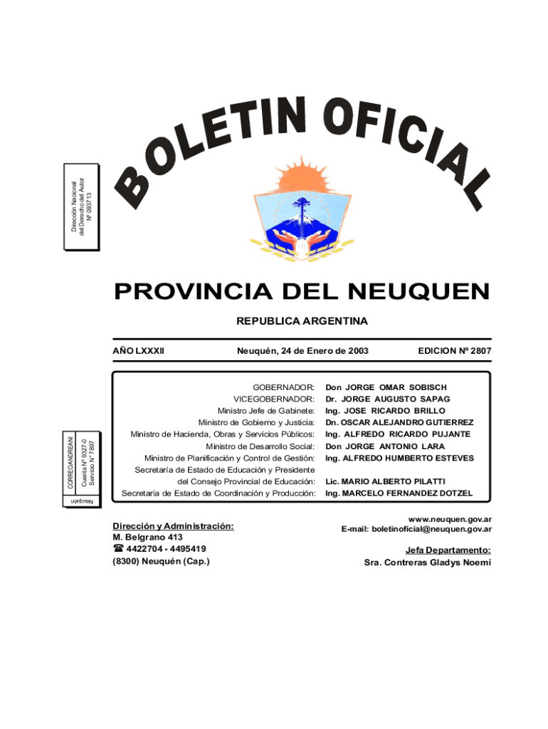 BOLTON OFICIALPAGINA 1Direccin Nacional del Each Del Actor N 093713Neuqun, 24 de Nero de 2003PROVINCIA DEL SEQUEL REPUBLICAN ARGENTINA AO LXXXIINeuqun, 24 de Nero de 2003GOBERNADOR: VICEGOBERNADOR:
