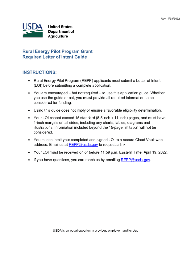 Rev. 1×28/2022Rural Energy Pilot Program Grant Required Letter of Intent Guide INSTRUCTIONS: Rural Energy Pilot Program (EPP) applicants must submit a Letter of Intent (LOI) before submitting a complete