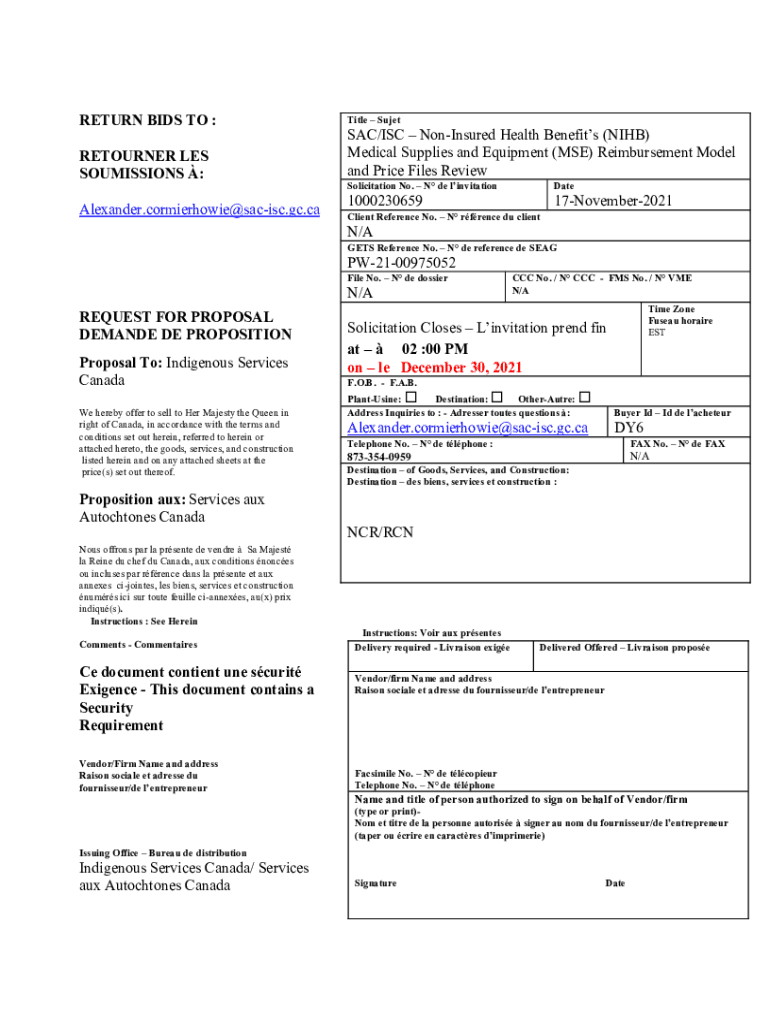 RETURN BIDS TO :Title SujetRETOURNER LES COMMISSIONS :SAC×ISC Uninsured Health Benefits (NIB) Medical Supplies and Equipment (MSE) Reimbursement Model and Price Files Review Alexander.cormierhowie×racism.GC.solicitation