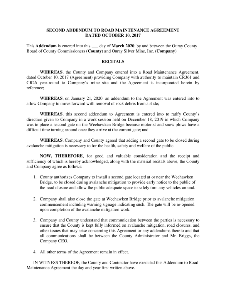 SECOND ADDENDUM TO ROAD MAINTENANCE AGREEMENT DATED OCTOBER 10, 2017, This Addendum is entered into this ___ day of March 2020, by and between the County Board of County Commissioners (County) and