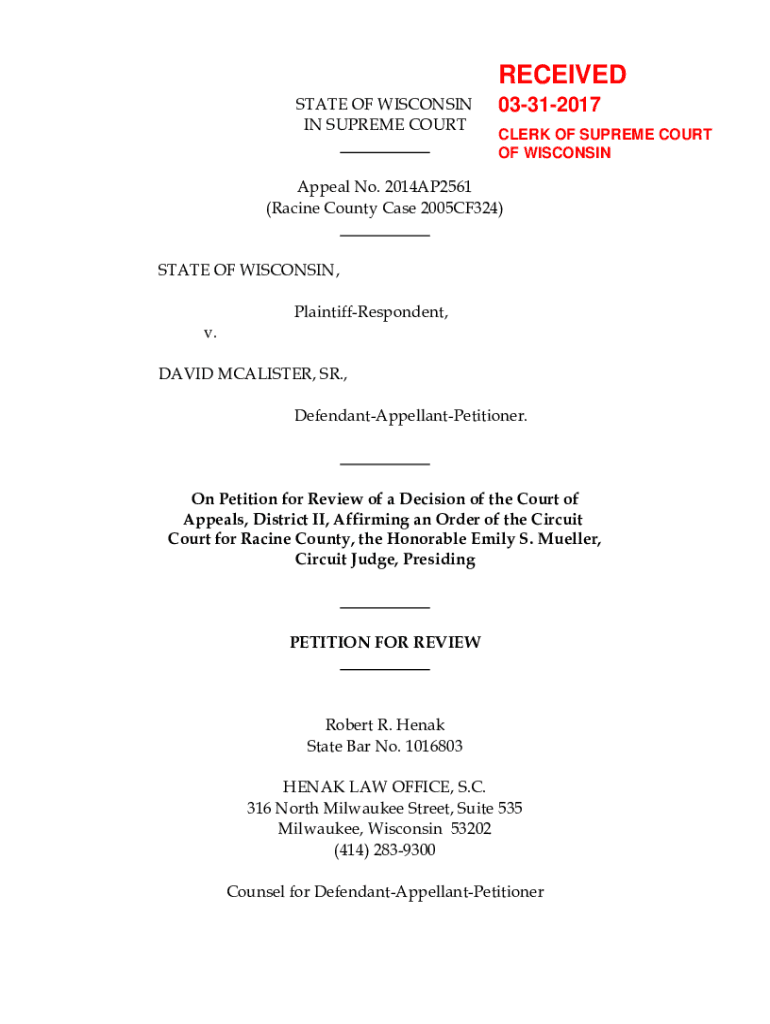 RECEIVED STATE OF WISCONSIN IN SUPREME COURT03312017 CLERK OF SUPREME COURT OF WISCONSINAppeal No. 2014AP2561 (Racine County Case 2005CF324×STATE OF WISCONSIN, PlaintiffRespondent, v. DAVID McAlister,