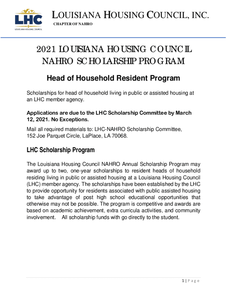 LOUISIANA HOUSING COUNCIL, INC. CHAPTER OF NAHRO2021 LOUISIANA HOUSING COUNCIL NAH RO SCHOLARSHIP PROGRAM Head of Household Resident Program Scholarships for head of household living in public or