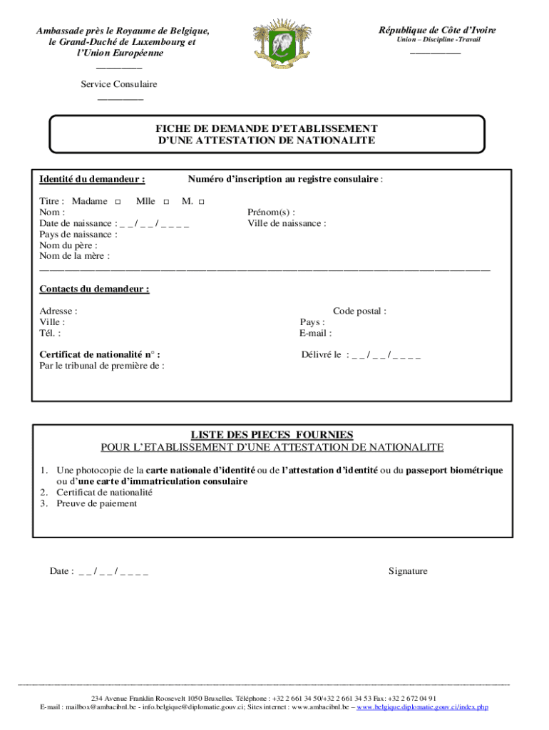 Oblique de Cte dIvoireAmbassade PRS LE Royale de Belgique, LE Grandeur de Luxembourg et Union European ___Union Discipline Travail___Service Consular ___FICHE DE DEMAND DETABLISSEMENT DUNE ATTESTATION
