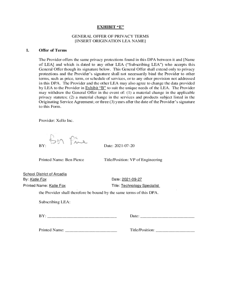 EXHIBIT E GENERAL OFFER OF PRIVACY TERMS [INSERT ORIGINATION LEA NAME] 1. Offer of Terms The Provider offers the same privacy protections found in this DPA between it and [Name of LEA] and which is