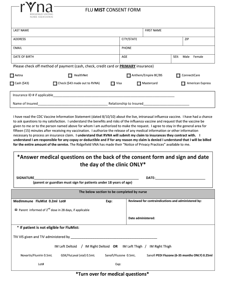 FLU MIST CONSENT FORM LAST NAME FIRST NAME ADDRESS CITY/STATE EMAIL PHONE DATE OF BIRTH AGE ZIP SEX: Male Female Please check off method of payment (cash, check, credit card or PRIMARY insurance)