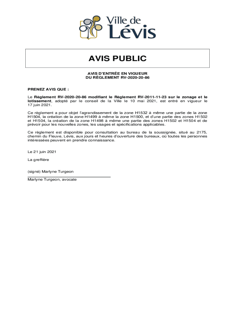 Get the free Avis d'entre en vigueurPublication du Rglement numro ...