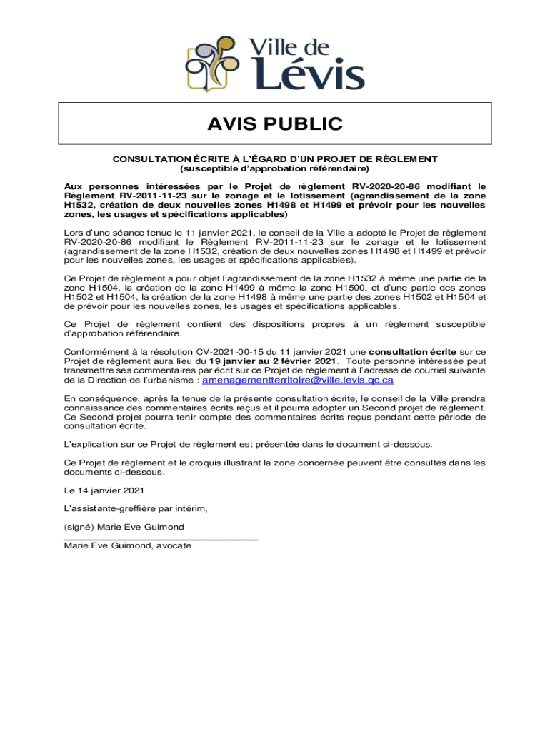 AVIS PUBLIC CONSULTATION WRITE LARD DUN PROJECT DE ELEMENT (susceptible approbation rendered) Aux personnel ingresses par LE Project DE element RV20202086 modified LE Element RV20111123 SUR LE nonage