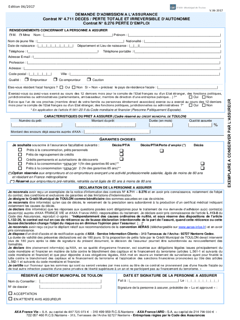 Edition 06×2017 V.062017DEMANDE ADMISSION A ASSURANCE Contract N 4.711 DECKS / PERTH TOTAL ET IRREVERSIBLE AUTONOMIC Contract N 8.276 PERTH EMPLOY REASSIGNMENTS CONCERN ANT LA PERSONNEL A ASSURER