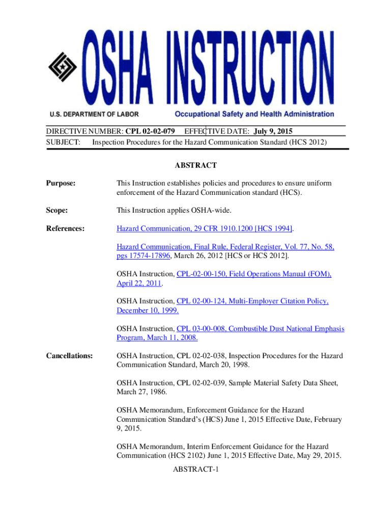 DIRECTIVE NUMBER: CPL 0202079 EFFECTIVE DATE: July 9, 2015, SUBJECT: Inspection Procedures for the Hazard Communication Standard (HCS 2012) ABSTRACT Purpose:This Instruction establishes policies and