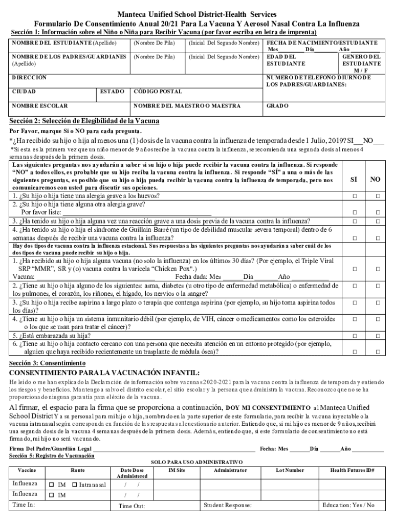 Manteca Unified School DistrictHealth Services Formulation De Consentimiento Annual 20×21 Para La Lacuna Y Aerosol Nasal Contra La InfluenzaSeccin 1: Information sober el NIO o NIA para Reciter Lacuna