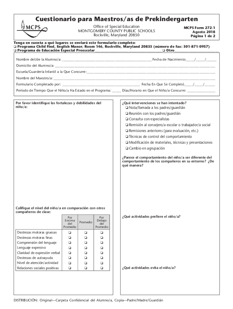 Cuestionario para Maestros×as DE Prekindergarten Office of Special Education MONTGOMERY COUNTY PUBLIC SCHOOLS Rockville, Maryland 20850MCPS Form 2721 Acosta 2018 Gina 1 de 2Tenga en cent an EU sugars