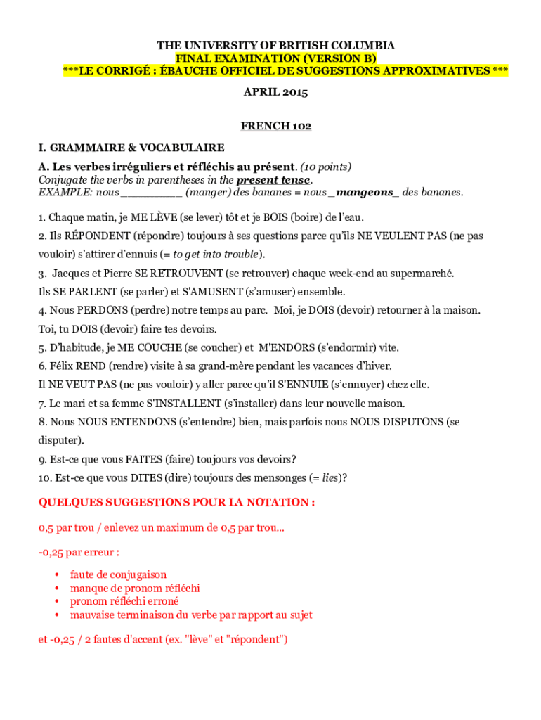 THE UNIVERSITY OF BRITISH COLUMBIA FINAL EXAMINATION (VERSION B) ***LE CORRIE : GAUCHE OFFICIAL DE SUGGESTIONS APPROXIMATES *** APRIL 2015 FRENCH 102 I. GRAMMAR & VOCABULARY A. Les verbs irregular