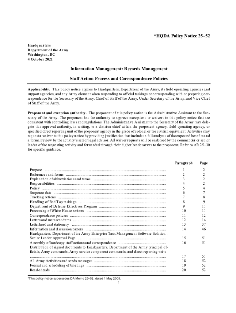 *HQ DA Policy Notice 2552 Headquarters Department of the Army Washington, DC 4 October 2021Information Management: Records Management Staff Action Process and Correspondence Policies Applicability.