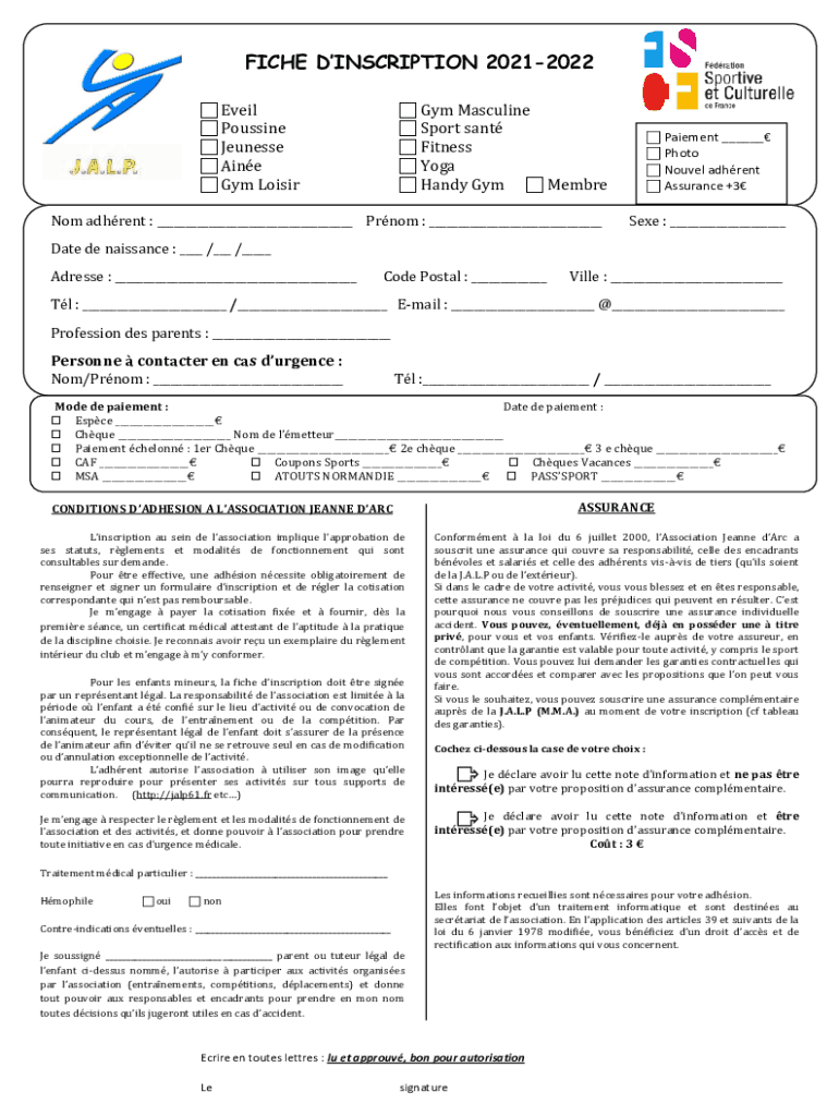 FICHE INSCRIPTION 20212022 Email Poussin Tennessee Fine Gym Lois Gym Masculine Sports ant Fitness Yoga Handy Gym Membrane adherent : ___ Prom : ___ Pavement ___ Photo Novel adherent Assurance +3Sexe