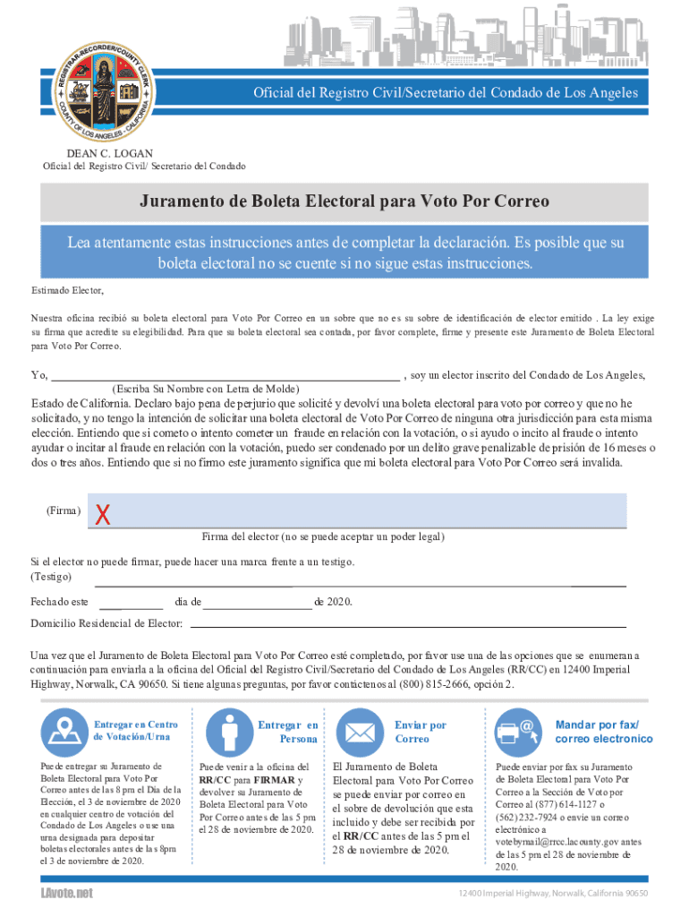 Official Del Registry Civil×Secretary del Condado de Los AngelesDEAN C. LOGANOficial Del Registry Civil/ Secretary del CondadoJuramento de Boleta Electoral para Vote POR Core Lea testament Estes