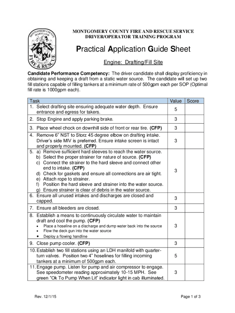 MONTGOMERY COUNTY FIRE AND RESCUE SERVICE DRIVER×OPERATOR TRAINING PROGRAMPractical Application Guide Sheet Engine: Drafting×Fill Site Candidate Performance Competency: The driver candidate shall