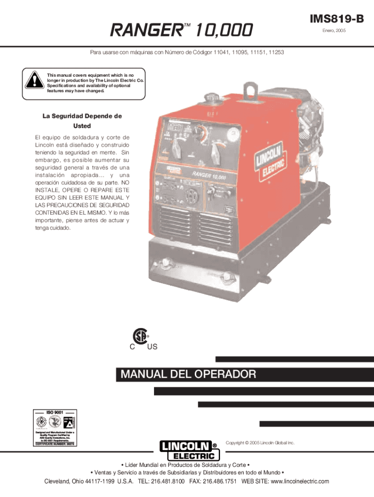 RANGER 10,000 IMS819B Nero, 2005Para users con Aquinas con Nero de Cdigor 11041, 11095, 11151, 11253This manual covers equipment which is no longer in production by The Lincoln Electric Co. Specifications