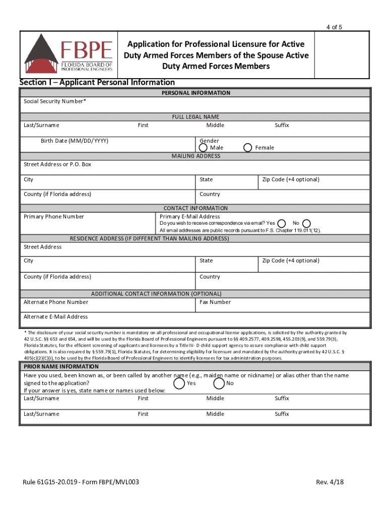 1 of 52639 North Monroe Street, Suite B112 Tallahassee, Florida 32303Application for Professional Licensure for Active Duty Armed Forces Members or the Spouse of Active Duty Armed Forces Members Rule