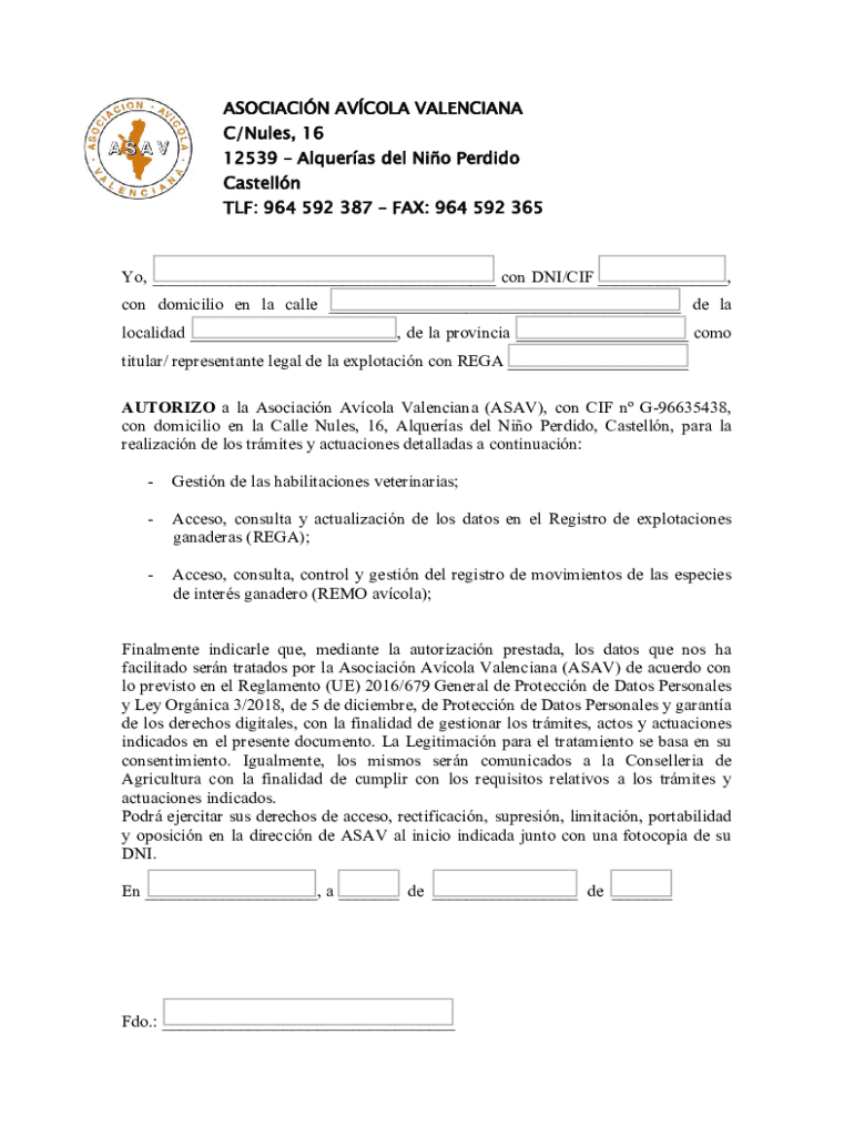 ASSOCIATION AV COLA VALENCIANA C×Rules, 16 12539 Acquires Del NIO Per dido Castellated: 964 592 387 FAX: 964 592 365Yo, ___ con DNI×CIF ___, con domicile en la called ___ DE la localized ___, DE