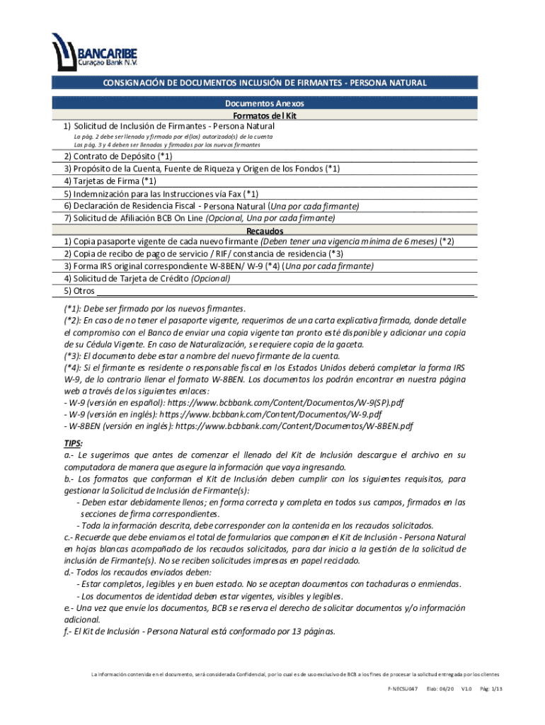 CONSIGNING DE DOCUMENTS INCLUSION DE FORMATS PERSONA NATURAL Documents Alexis Formats del Kit 1) Solicited DE Inclusion de Firmantes Persona Natural La pg. 2 debt SER Grenada y Narmada PO Rel×Los)