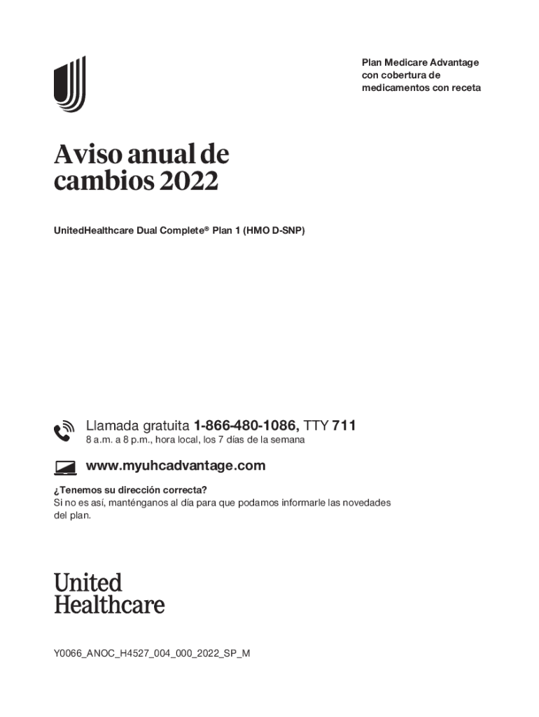 Plan Medicare Advantage con overture DE medicament con recetaAviso annual DE cam bios 2022 UnitedHealthcare Dual Complete Plan 1 (HMO DSP×Lambda gratuity 18664801086, TTY 711 8 a.m. at 8 p.m., hora