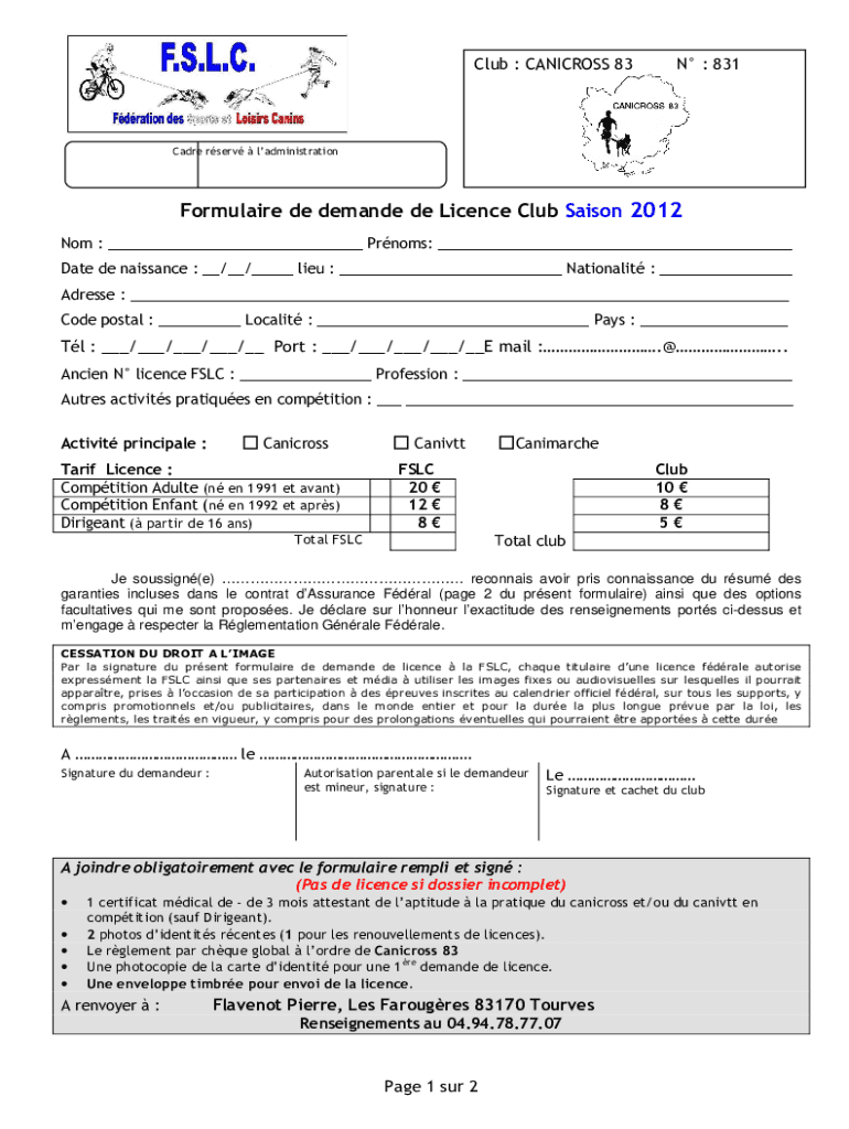 Club : ACROSS 83 N : 831Cadre serve ladministrationFormulaire de demand DE License Club Saigon 2012 Not : ___ Proms: ___ Date de Renaissance : __/__/___ lieu : ___ Nationalist : ___ Address : ___