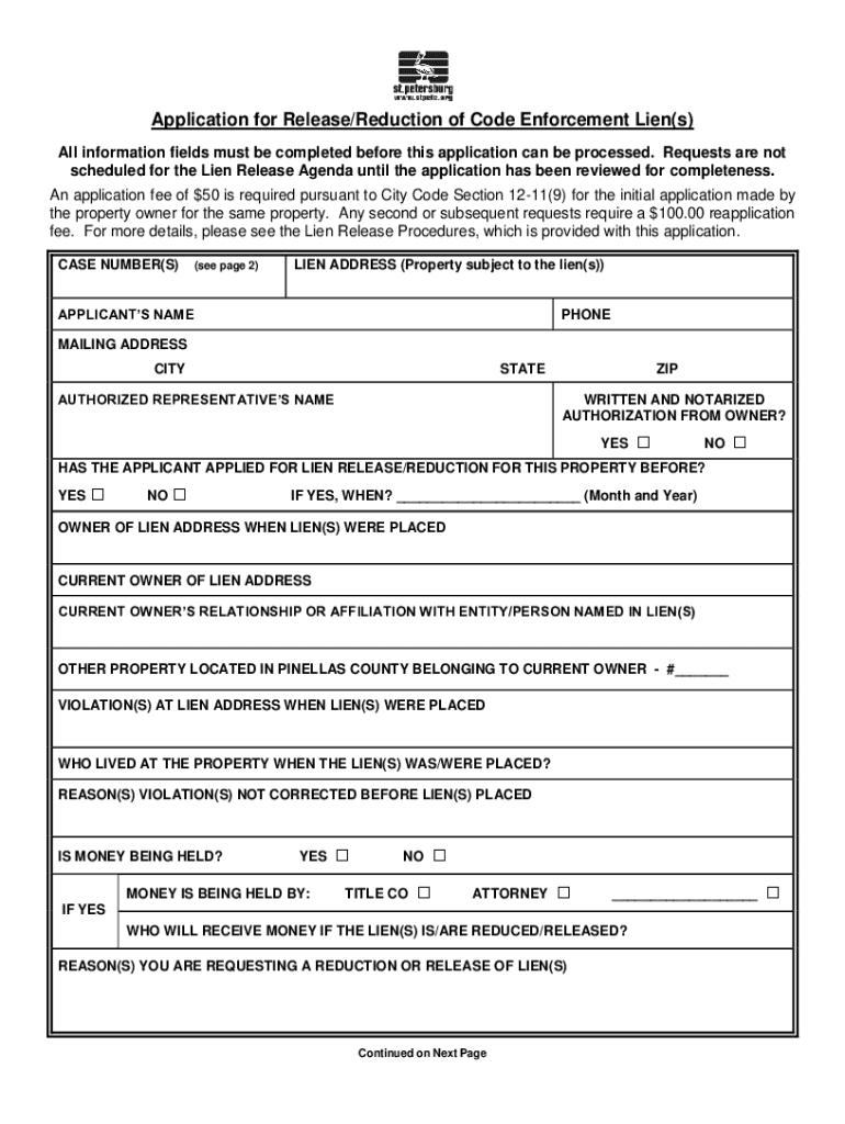 Application for Release×Reduction of Code Enforcement Lien’s) All information fields must be completed before this application can be processed. Requests are not scheduled for the Lien Release