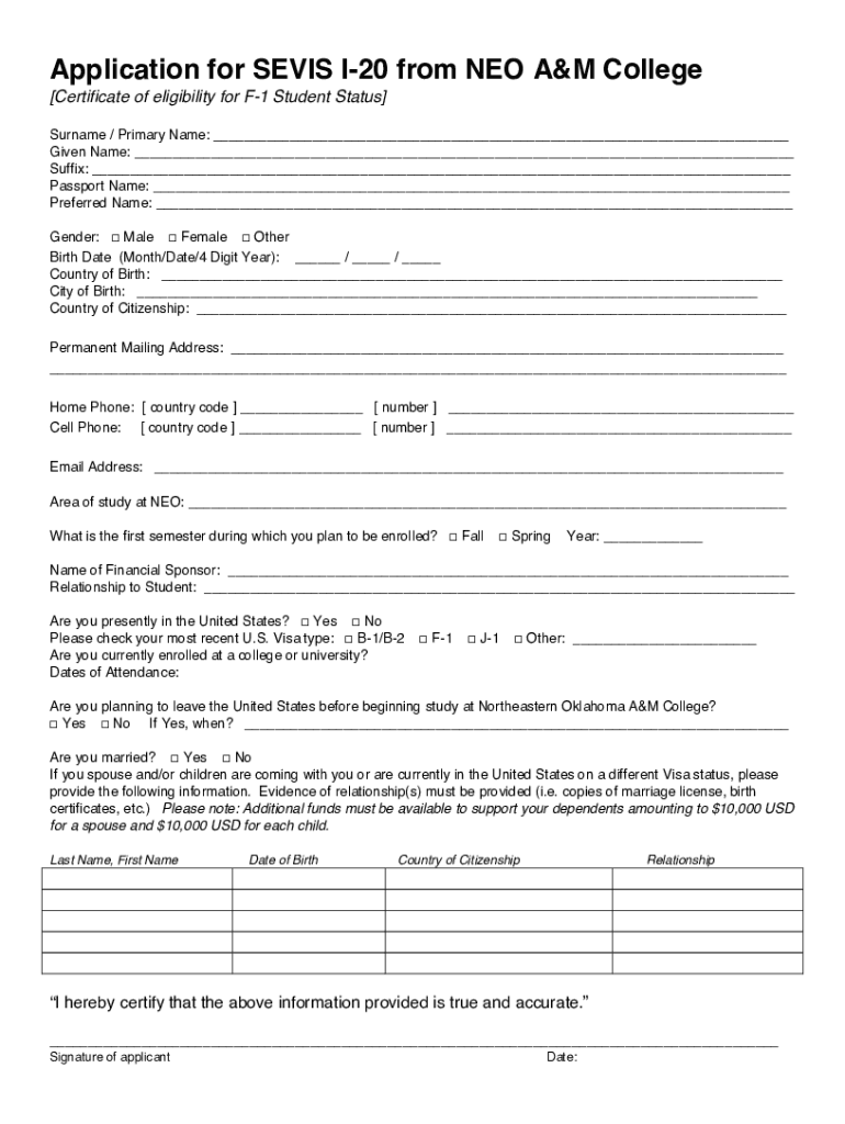 Application for NEVIS I20 from NEO A&M College [Certificate of eligibility for F1 Student Status] Surname / Primary Name: ___ Given Name: ___ Suffix: ___ Passport Name: ___ Preferred Name: ___ Gender: