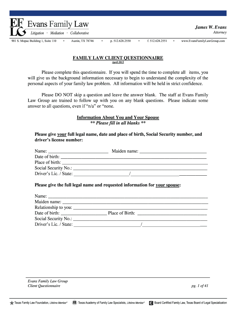 FAMILY LAW CLIENT QUESTIONNAIRE April 2013 Please complete this questionnaire. If you spend the time to complete all items, you will give us the background information necessary to begin to understand