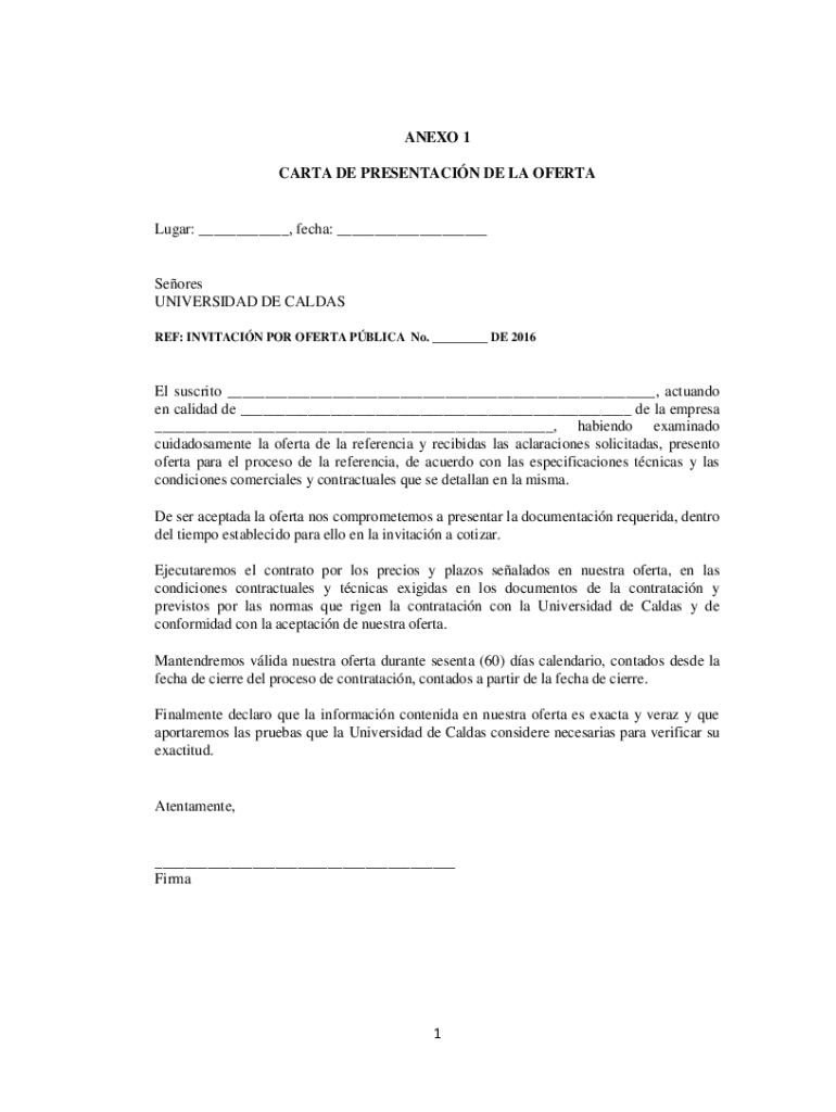 NEXT 1 CARTA DE PRESENTATION DE LA OFERTALugar: ___, tech: ___Stores UNIVERSITY DE CALLAS REF: INVITATION POR OMERTÀ PBL ICA No. ___ DE 2016El subscribe ___, actually en Caliban de ___ DE la empress
