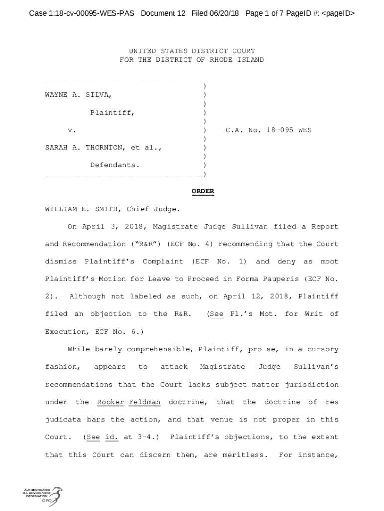 Case 1:18cv00095WESPAS Document 12 Filed 06×20/18-Page 1 of 7 Paged #: pageIDUNITED STATES DISTRICT COURT FOR THE DISTRICT OF RHODE ISLAND ___))) Plaintiff,) ) v.) ) SARAH A. THORNTON, et al.,) )