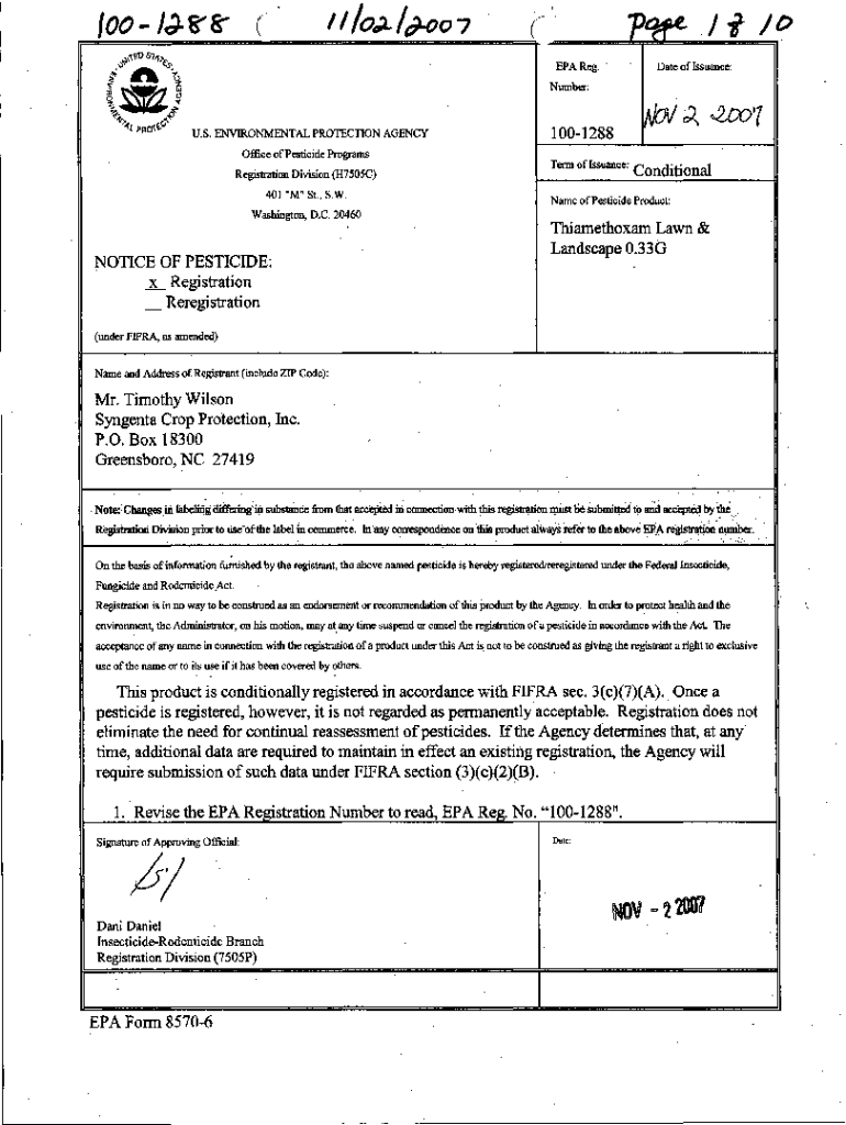 100 Idris×O, ×07(Tl, ×RNA Reg. \'Ii I 0Date of Issuance:Number:U.S. ENVIRONMENTAL PROTECTION AGENCY1001288! Nov 1Office of Pesticide Programs Registration Division (H7S0SC) 401 \” M\” St.,