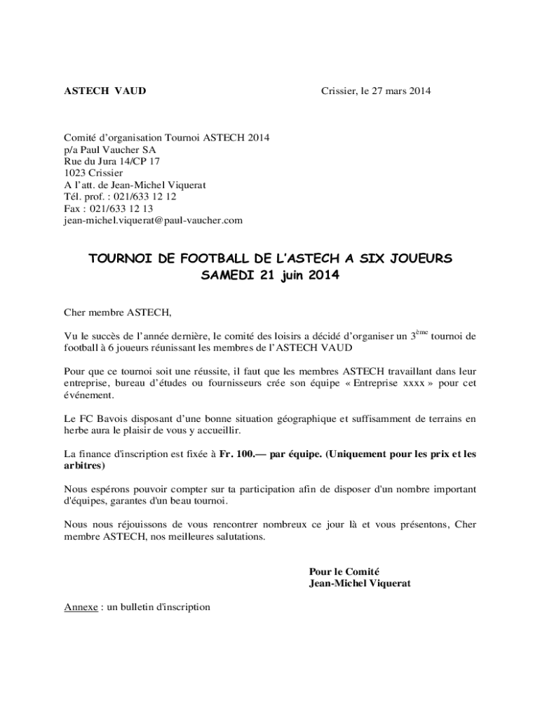 ADTECH VAUDCrissier, LE 27 Mars 2014Comit organization Tourney ADTECH 2014 p×a Paul Voucher SA Rue Du Jury 14×CP 17 1023 Crispier A last. De Jean Michel Visceral Tl. prof. 021×633 12 12 Fax :