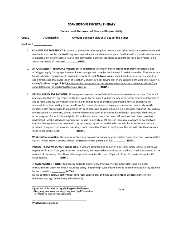 CORNERSTONE PHYSICAL THERAPY Consent and Statement of Financial Responsibility Copay ___/ Deductible ___ Amount due each visit until deductible is met ___ Visit limit ___ 1.CONSENT FOR TREATMENT:
